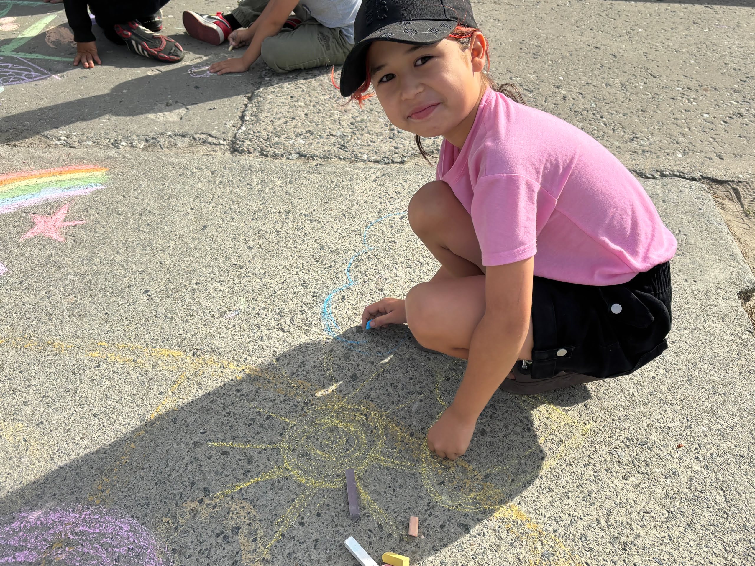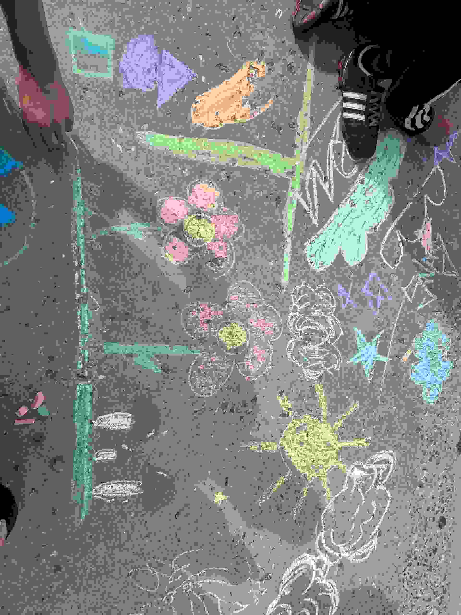 Цветные мелки, асфальт и неисчерпаемая детская фантазия были в арсенале юных художников. И через несколько минут на сером асфальте появилась радуга красок. Дети рисовали солнце, радугу, животных, мультяшных героев.