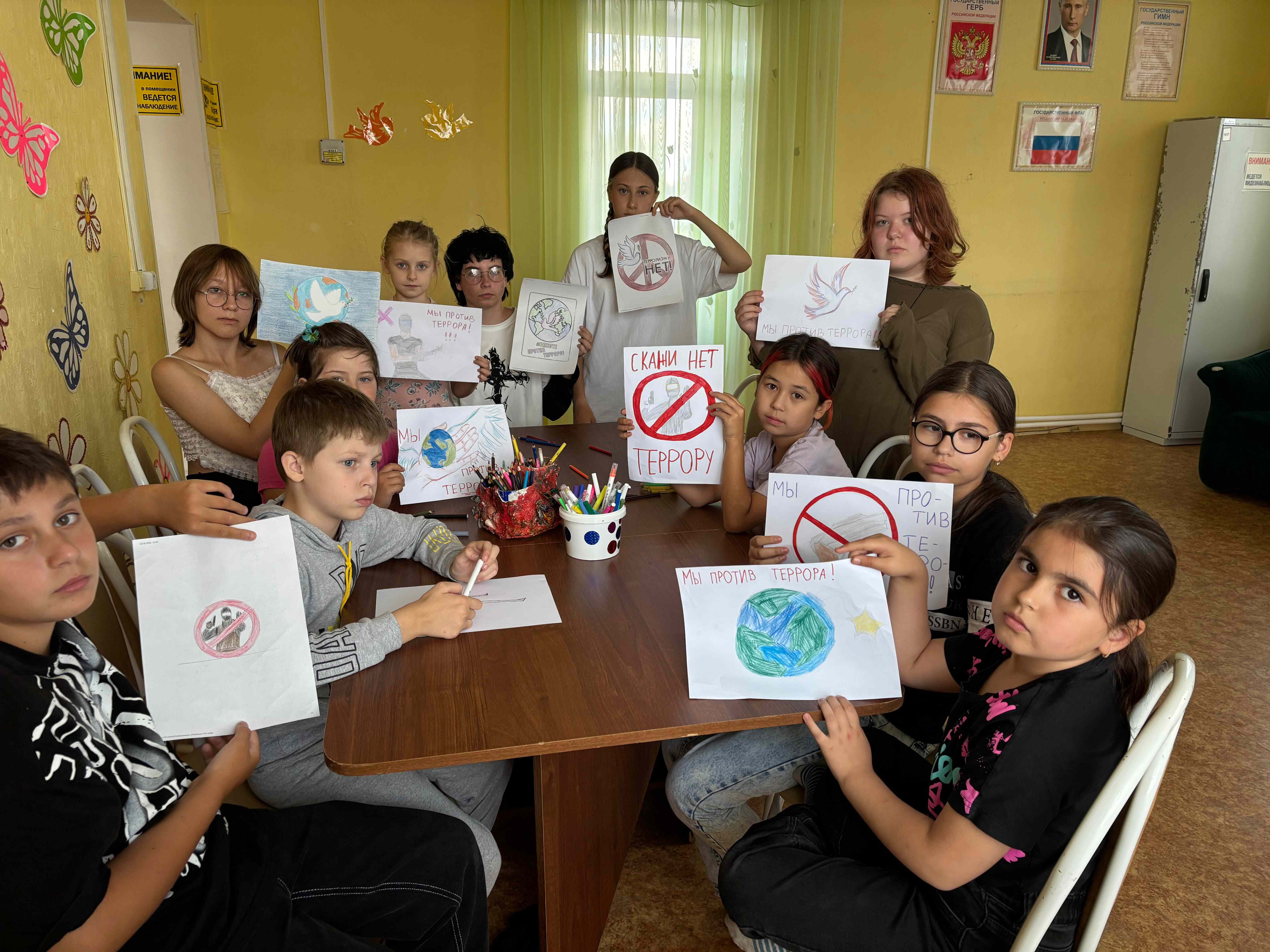Дети постарались внести свой маленький вклад в борьбу за мир во всем мире и выразить то, что олицетворяет мир на земле через свои рисунки. На рисунках ребят изображены: дети с плакатом, на котором написано: “Нет терроризму!”, зачеркнутые красным цветом фигуры в черном, угрожавшие детям, голуби мира на фоне голубого неба.