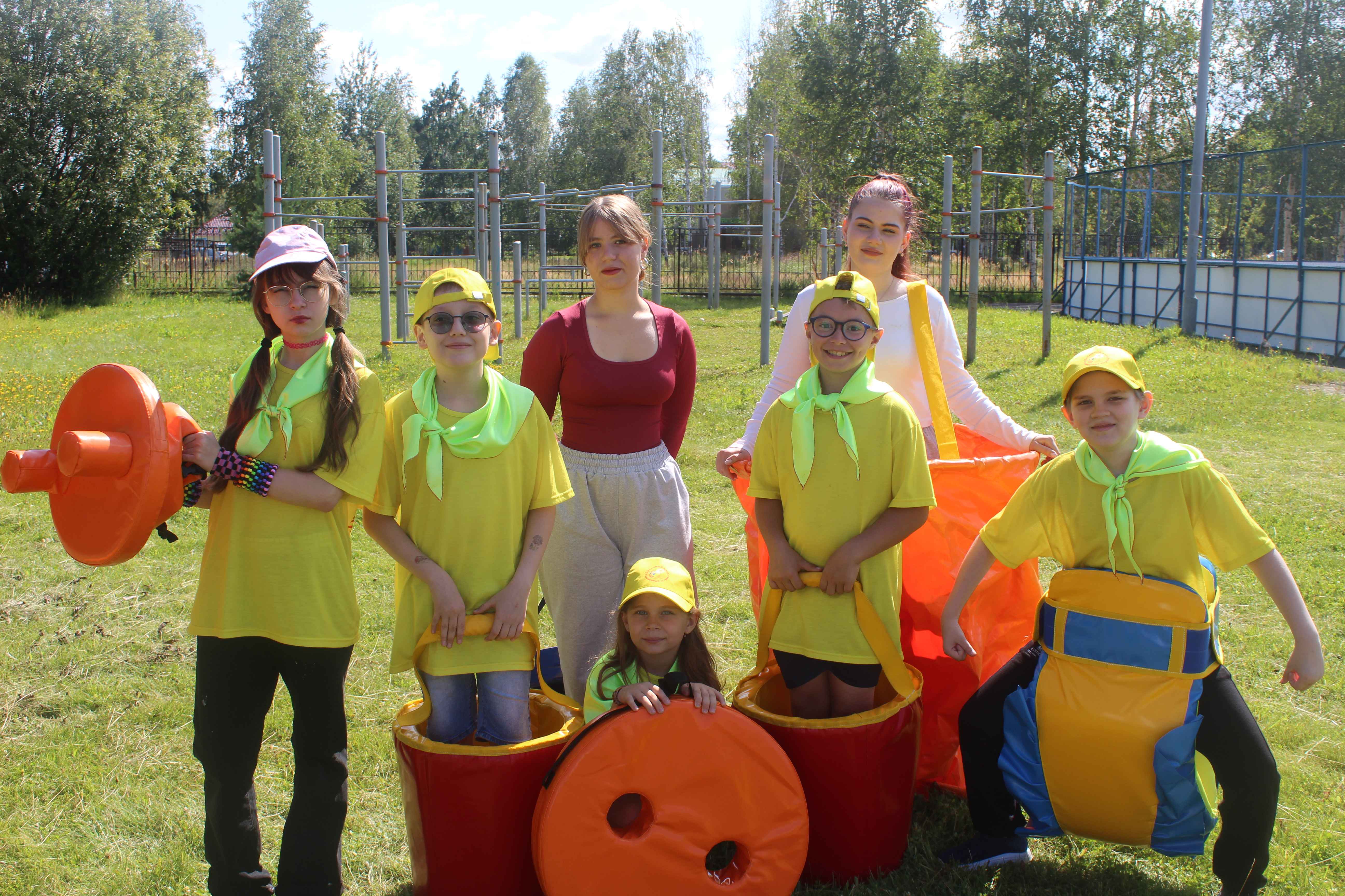 В веселых стартах участвовало 6 команд «Солнечный остров» и «Черёмушки», «Мечта» и «Планета», а так же к нам присоединились ребята пришкольной летней оздоровительной площадки. Мальчишки и девчонки бегали в «ведрах», гигантских «памперсах», на скорость собирали «бургер» и демонстрировали меткость, попадая шариками в «штаны-ловуны», а последним испытанием для команд стало перетягивание каната.
